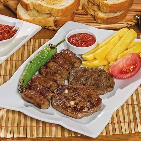 Grilled Meatballs, İnegöl Meatballs, Tekirdağ Meatballs, Misket Meatballs, French Fries, Seasonal Greens, Yoghurt and Served with Tomato Paste.